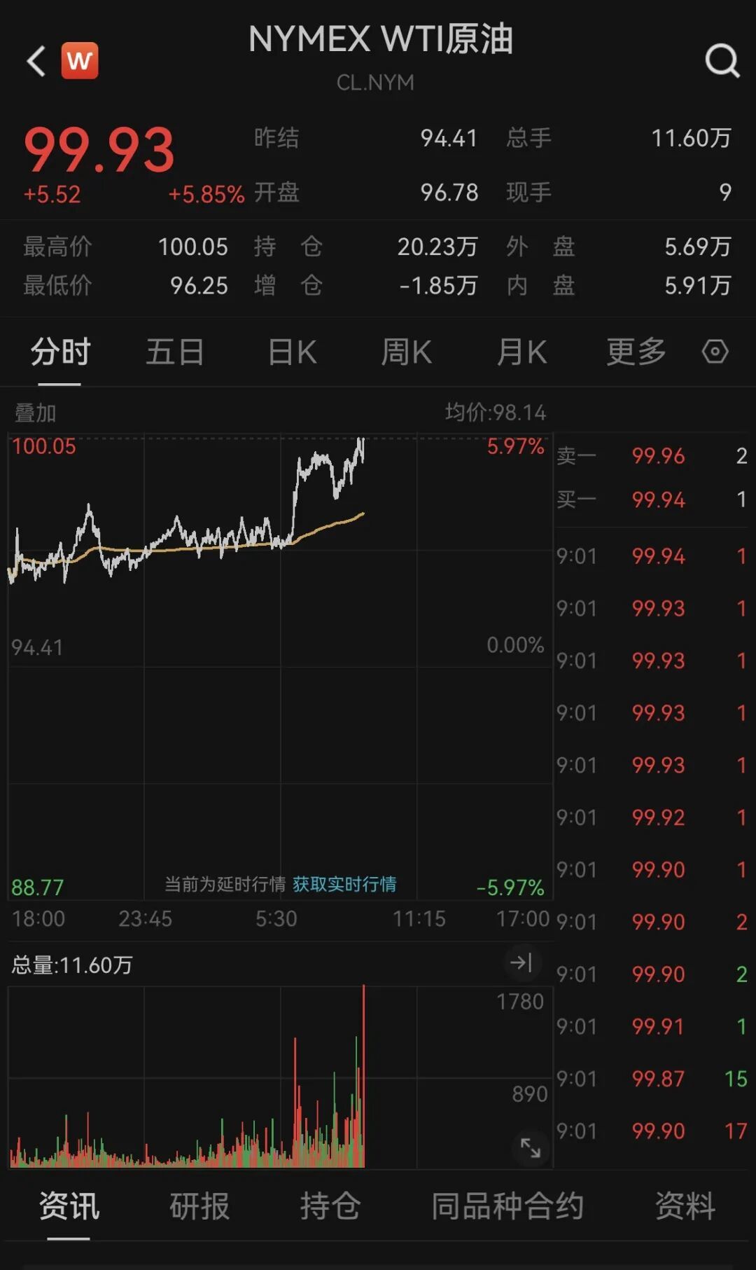 北京时间9日晚间,国际油价大幅上涨,截至发稿,WTI原油期货涨超5%,报100.05美元/桶,布伦特原油期货涨超3%,报98.50美元/桶。
